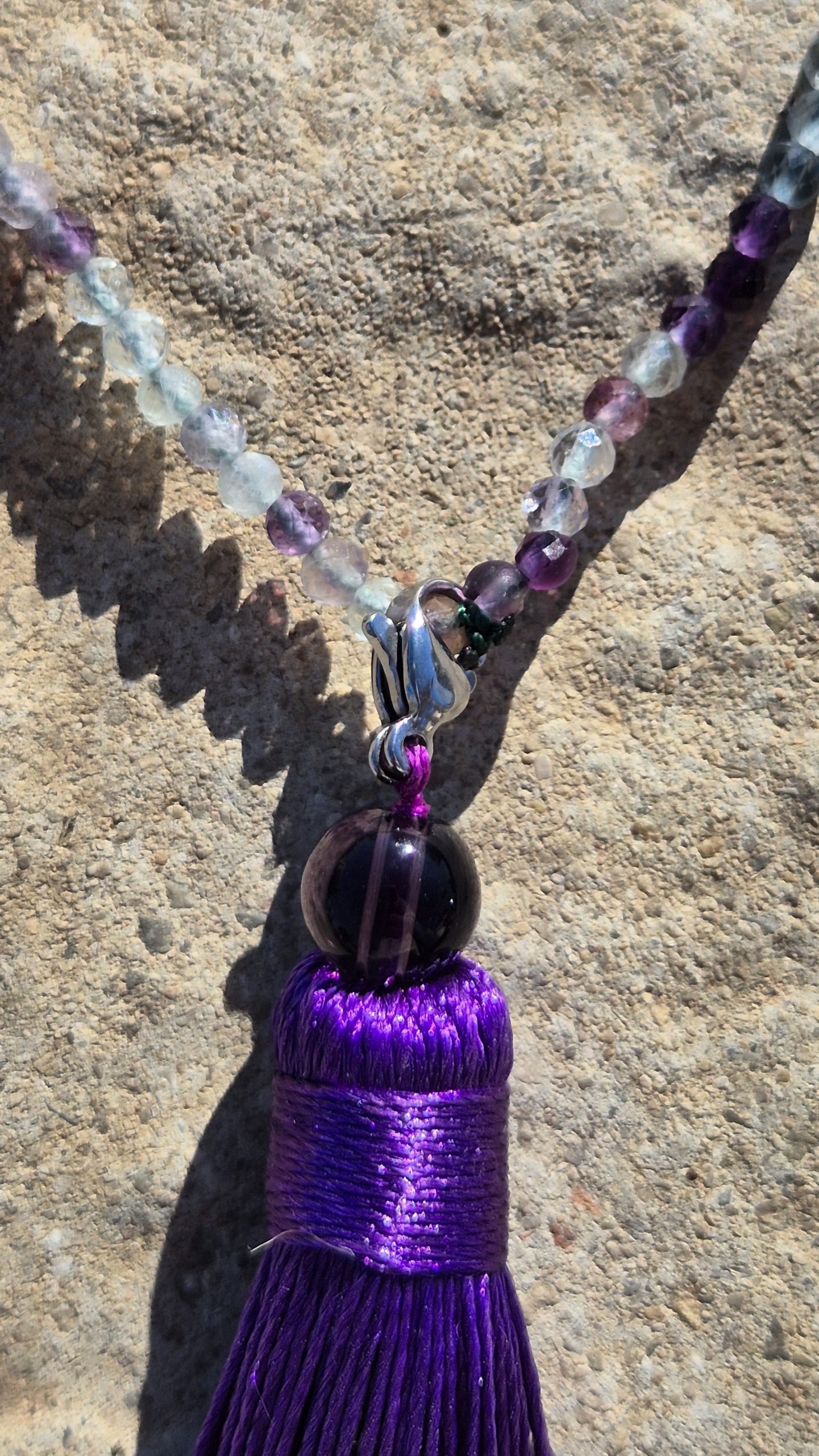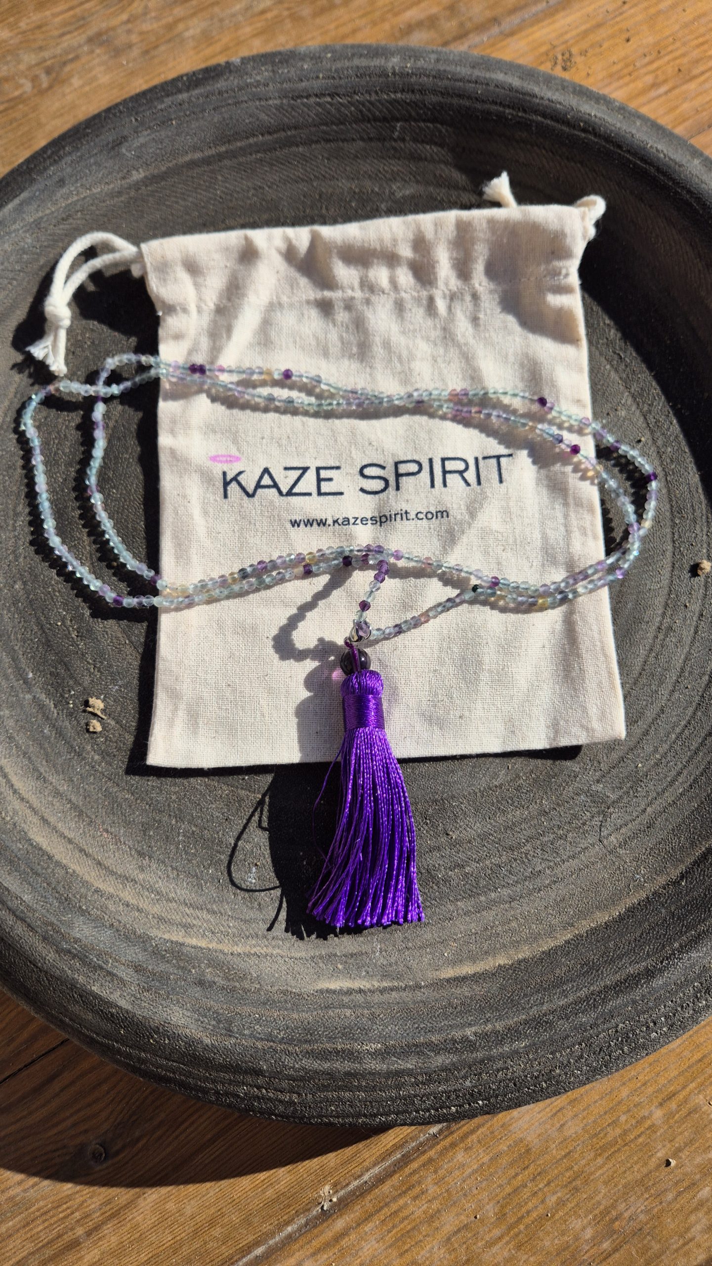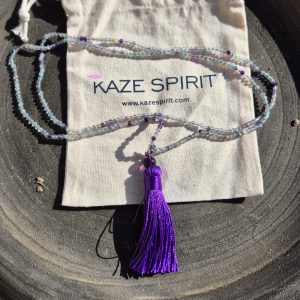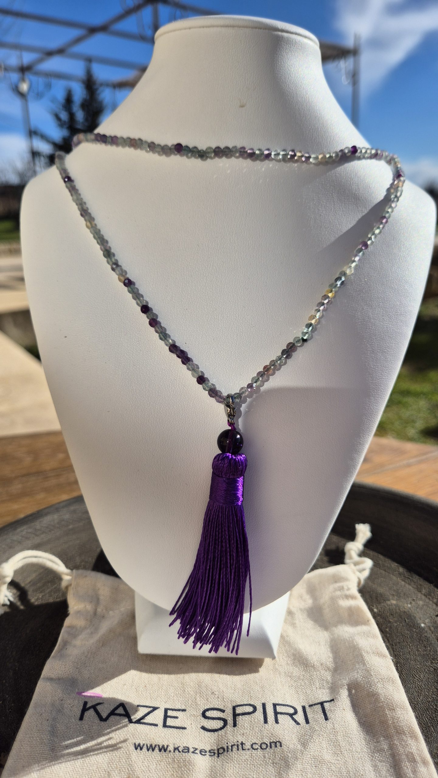Plongez dans l’univers unique de Kazespirit avec ce somptueux collier mala en fluorine véritable, composé de pierres facettées soigneusement sélectionnées. Chaque perle facettée, taillée avec précision, capte la lumière et révèle les nuances fascinantes de la fluorine, allant des verts apaisants aux violets inspirants.